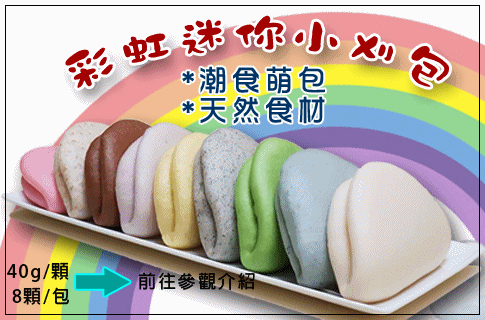 Q坊-七彩彩虹迷你小刈包,以天然食材本身特有的鮮艷色澤製作各種迷你小刈包,每顆重量定量40g以上,